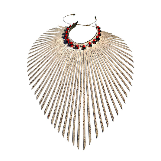 Gargantilla de piel con flecos estampados en color crema adornada con piedras negras y cuentas de cristal de cuarzo rojo