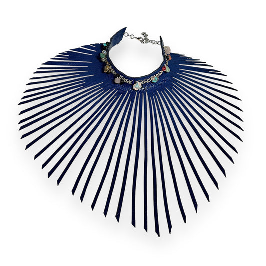 Gargantilla de cuero con flecos en relieve y estampado azul adornada con una selección de piedras preciosas y cuentas de cristal de cuarzo