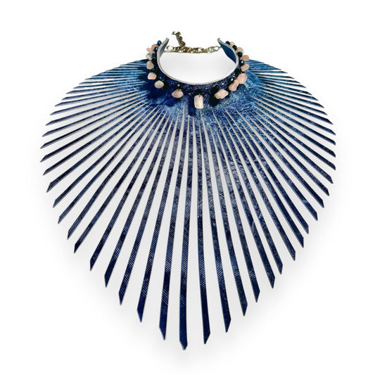 Gargantilla de piel con efecto denim y flecos adornada con piedras turquesas y cuentas de cristal dorado