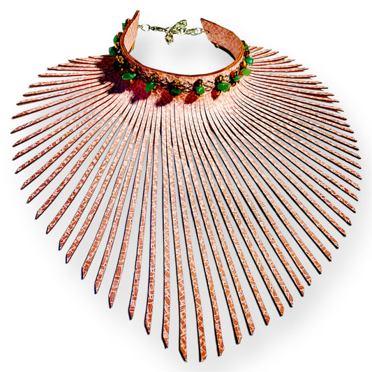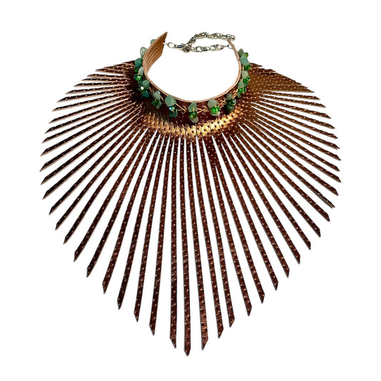 Gargantilla de piel con flecos en relieve de oro rojo adornada con piedras de jade y cuentas de cristal de cuarzo