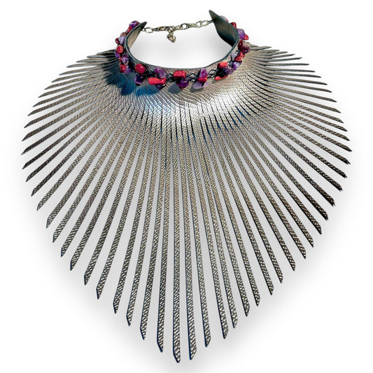 Gargantilla de cuero con flecos plateados en relieve y diseño adornado con piedras de amatista y arena dorada