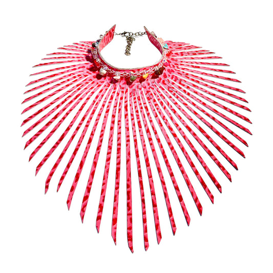Gargantilla de cuero con flecos en relieve y estampado en colores pastel adornada con varias piedras preciosas y cuentas de cristal de cuarzo