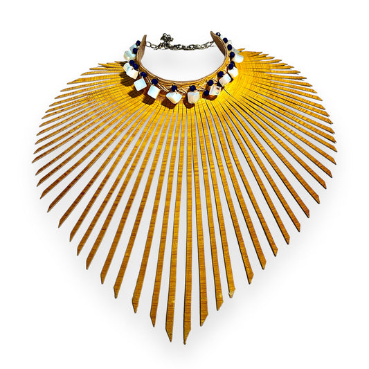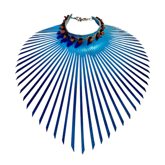 Gargantilla de cuero con flecos en relieve amarillo adornada con piedras preciosas de Opel y cuentas de cristal azul.