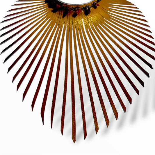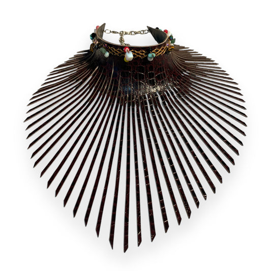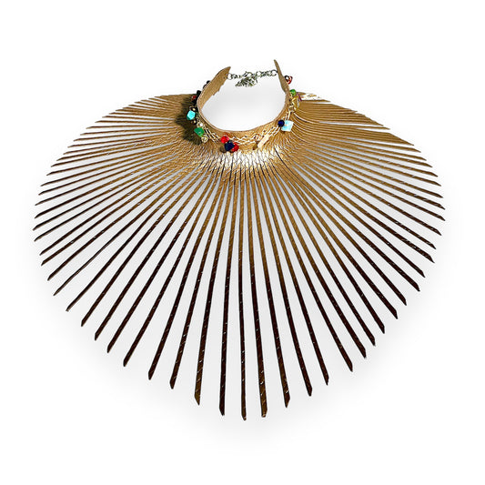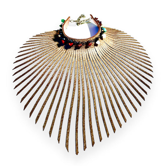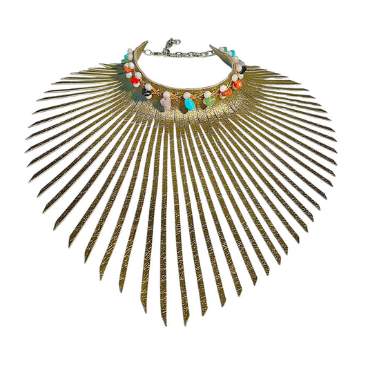 Gargantilla de cuero con flecos en relieve dorado adornada con múltiples piedras preciosas y cuentas de cristal de cuarzo