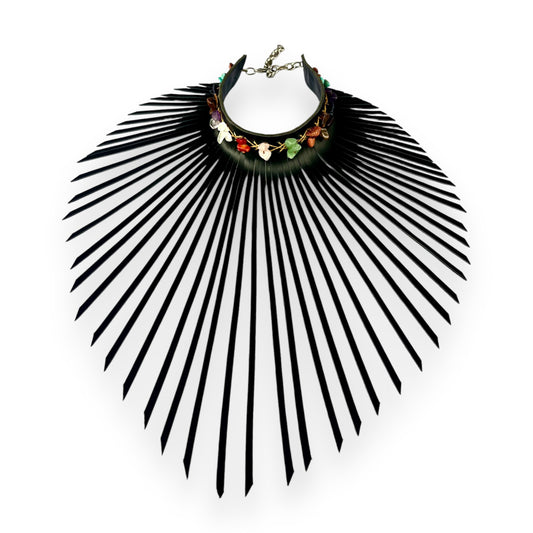 Gargantilla con flecos de cuero negro adornada con una selección de piedras preciosas y cuentas de cristal de cuarzo transparente.