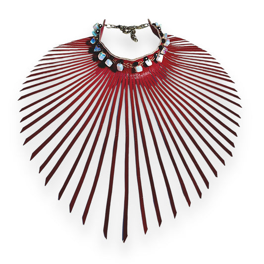 Rose Artistic Colour Splashed Leather Fringe Choker Adorned With Opel Raw Gem Stones