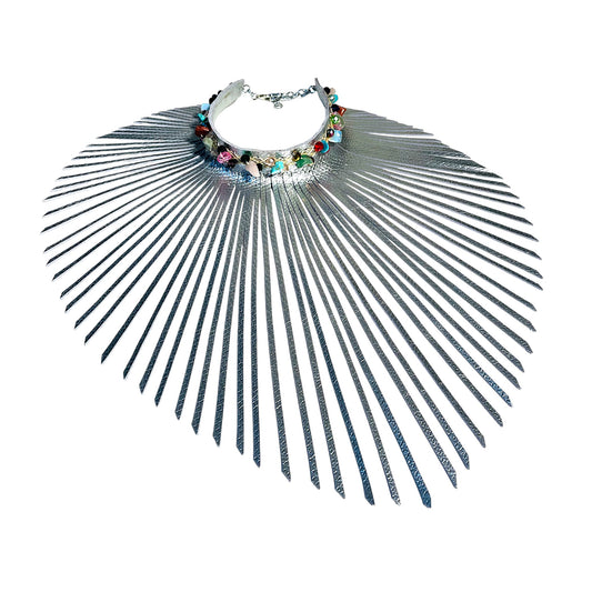 Gargantilla con flecos de cuero plateado en relieve adornada con una selección de piedras preciosas y cuentas de cristal de cuarzo