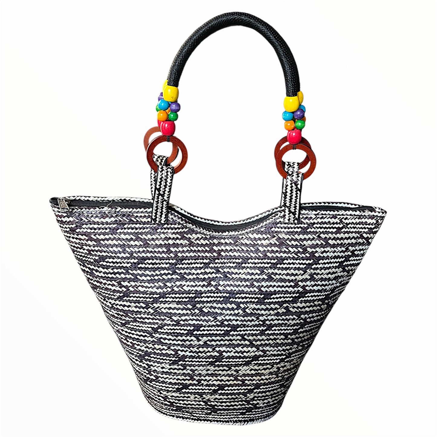 Crafted from organic fibres, this handbag offers a tactile, natural feel while presenting a distinctive circle pattern. The wood-and-fabric handle provides comfortable carry and visual contrast, while the black fabric lining and internal pocket keep essentials organized. Thoughtfully sized for daily carry, the bag pairs well with casual and dress outfits.